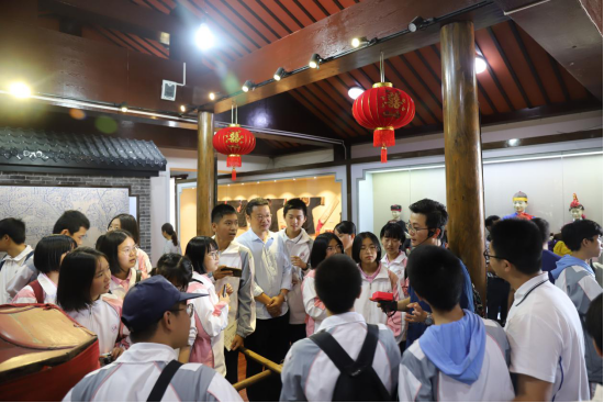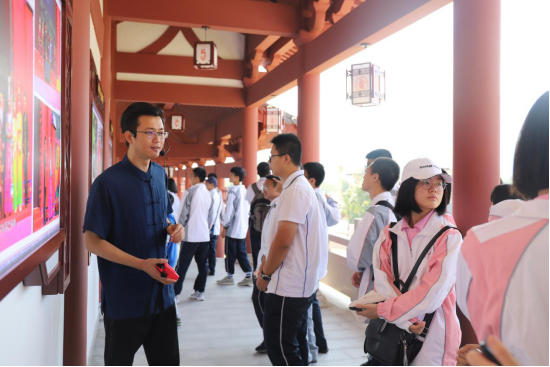 图为同学们观看了解畲族宫回廊墙上的畲族文化