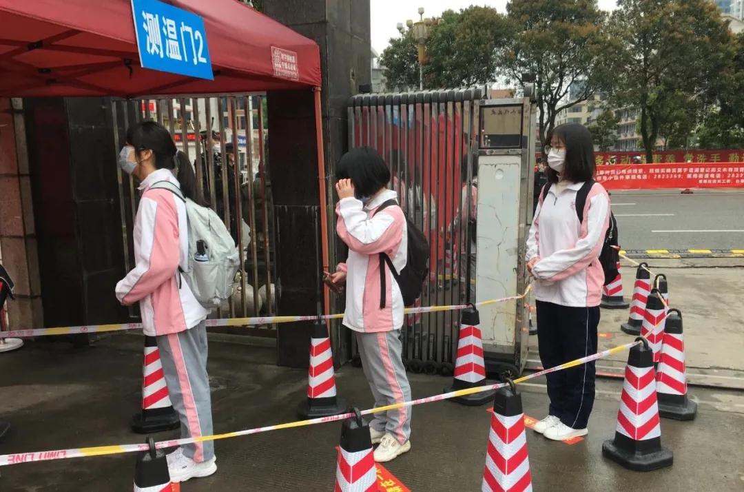 (学生们穿校服、戴口罩、保持距离,有序进校园)